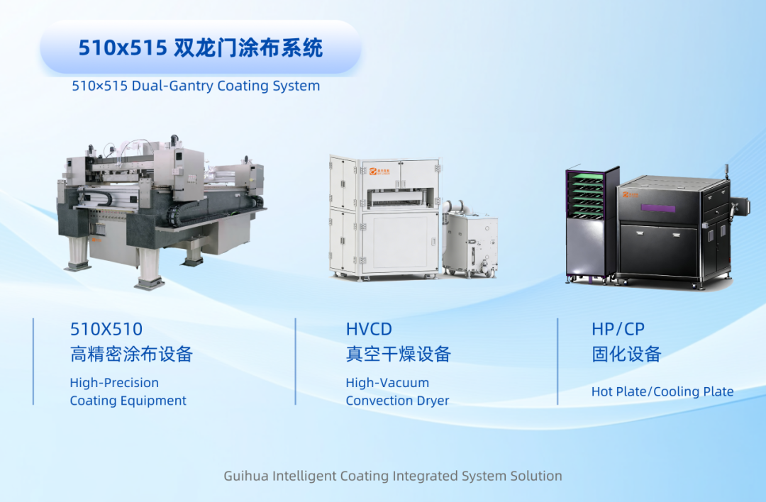 Guihua Intelligent Integrated Flat Panel Slit Coating, Drying and Curing Systemcovers two major series: single-gantry and dual-gantry. Product dimensions range from 400×300 mm up to 2400×1200 mm. It is equipped with VCD (vacuum drying), HVCD (heated vacuum drying), HP (heating), CP (cooling) and other modules, enabling fully integrated operation from substrate loading, coating and drying to curing.